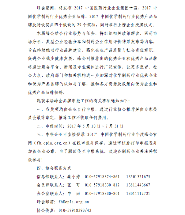 【转发】关于申报“2017中国化学制药行业优秀企业和优秀产品品牌”的通知